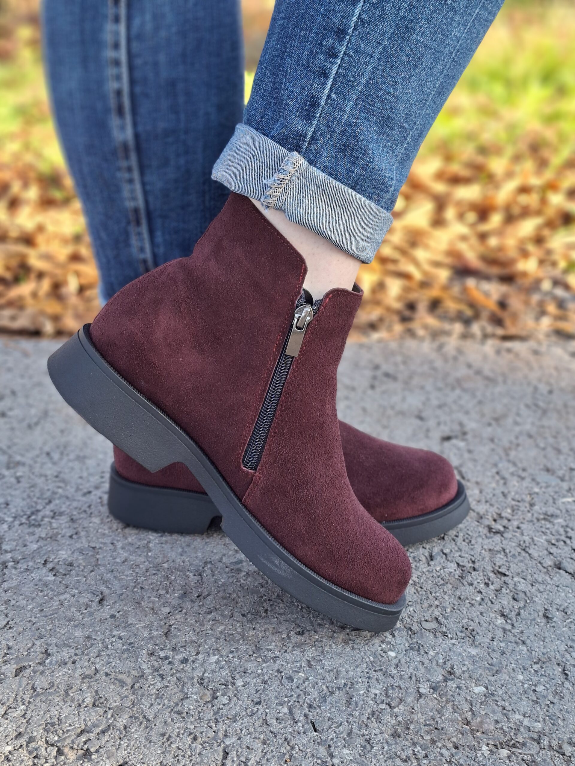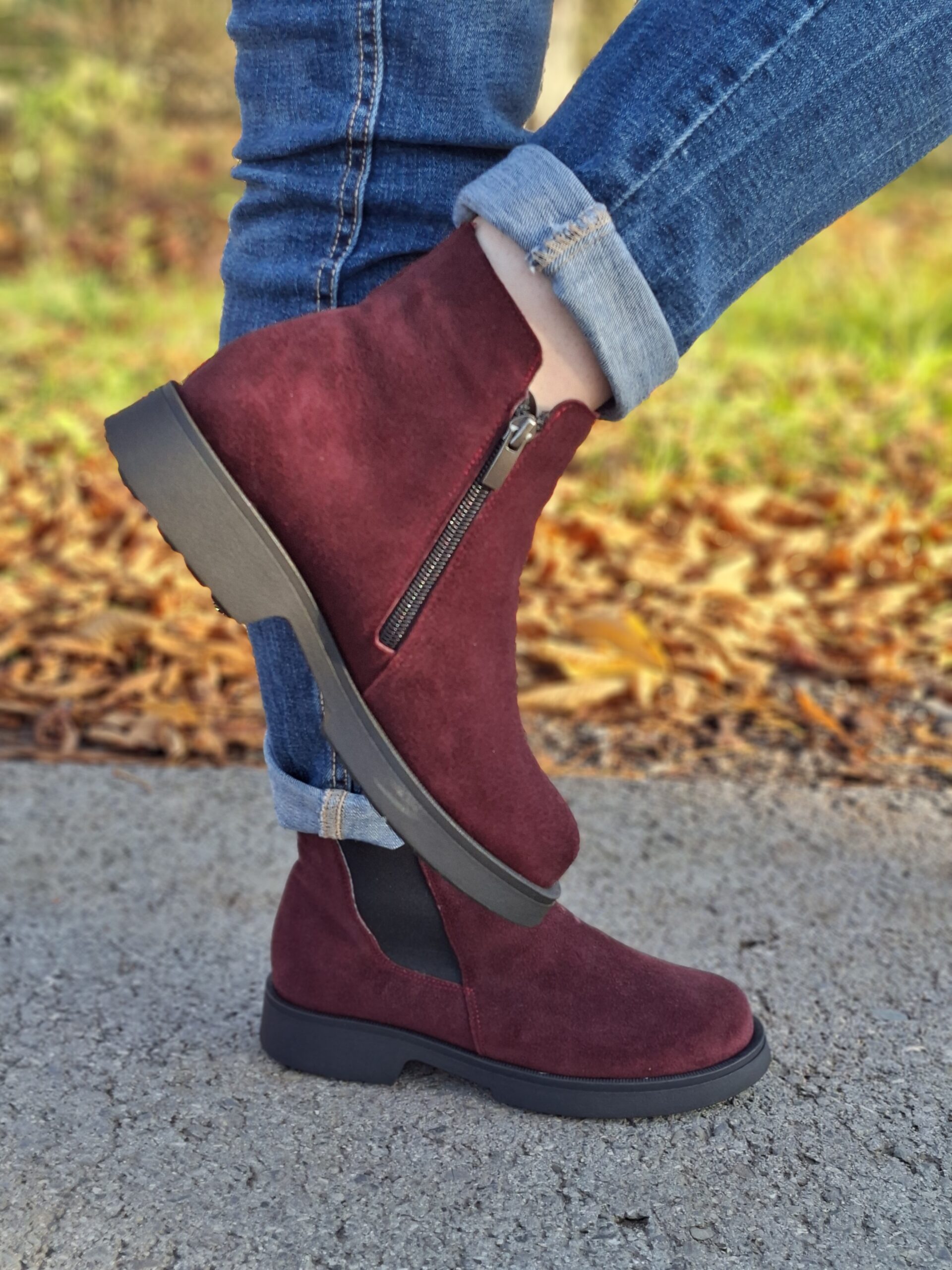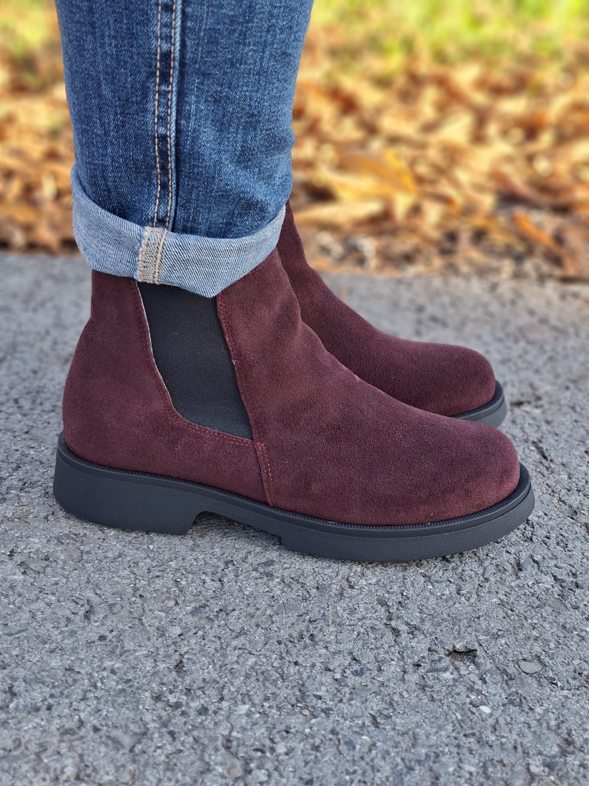 Botki Chelsea Bordeaux to ponadczasowa klasyka w jesiennej odsłonie. Wykonane z miękkiego, naturalnego weluru w odcieniu głębokiego bordo, idealnie dopasowują się do stopy, zapewniając wygodę przez cały dzień.