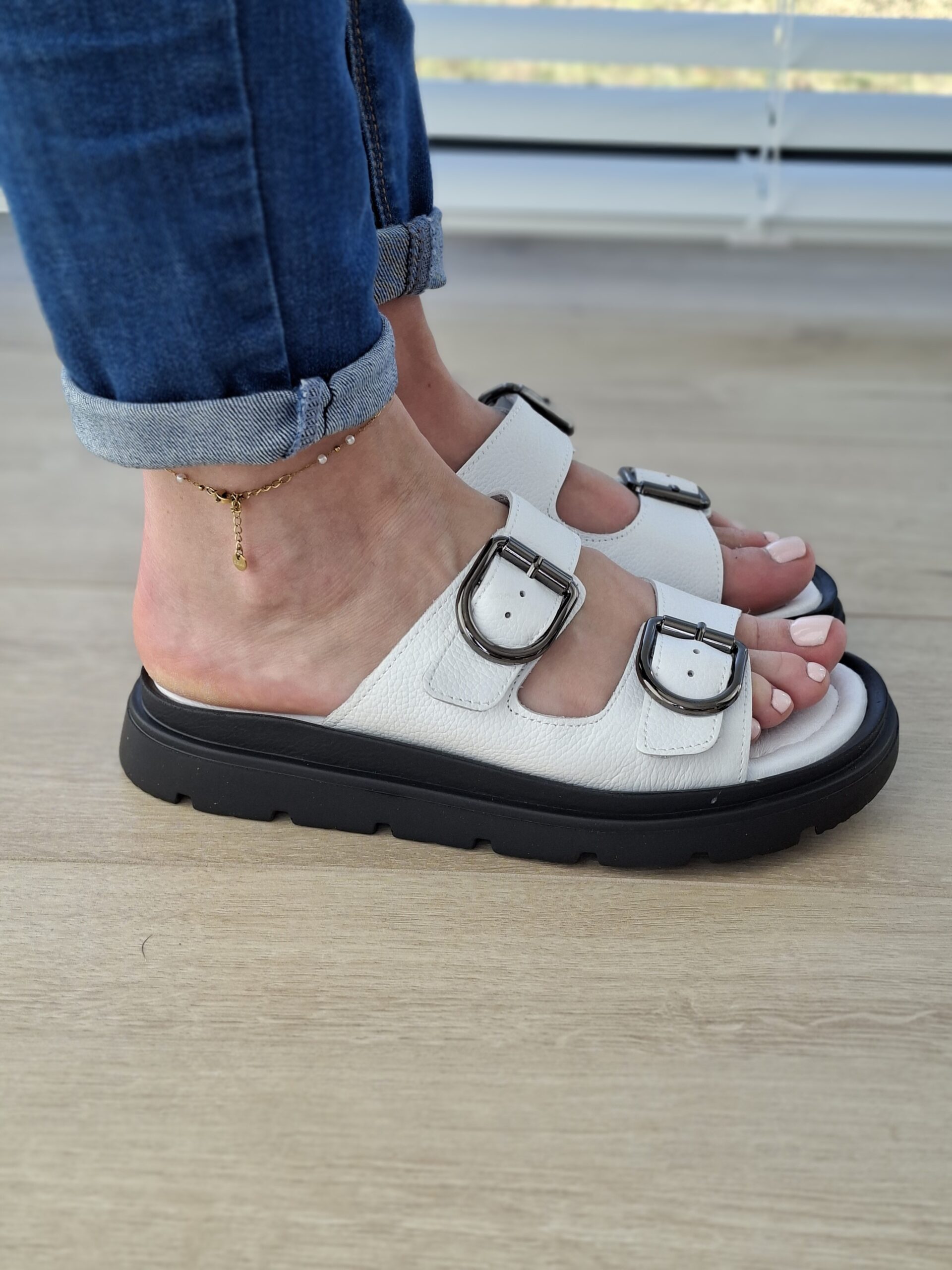 Białe klapki na lekkim spodzie. Noski zaokrąglone. Wyściółka skórzana na miekkiej piance bardzo wygodne.Model z regulowaną klamrami cholewką pozwalającą na indywidualne dopasowanie szerokości.Minimalistyczny wzór, idealnie skomponuje się z letnimi stylizacjami, dodając im oryginalności. Komfort i wygodę zapewni miękka, skórzana wkładka. Klapki idealnie sprawdzą się w codziennym użytkowaniu.